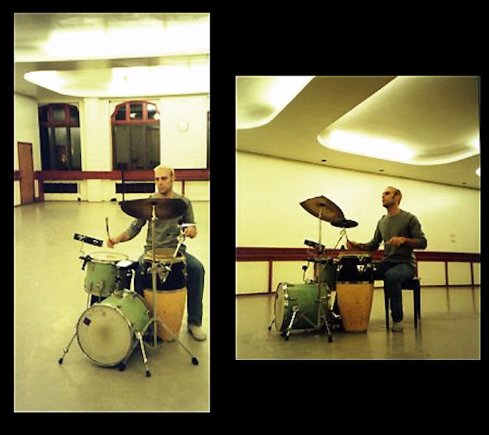 Chris playing his percussive drumset used for dance classes and improv performances