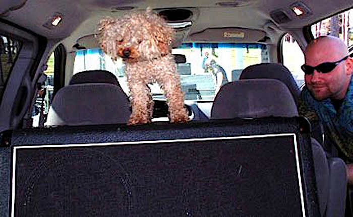 Peanut, my trusty roadie helping unload gear
